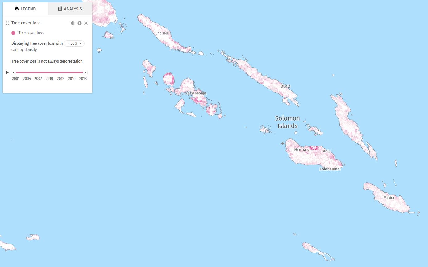 Map displaying tree cover loss with > 30% canopy density, between 2001-2018. Tree cover loss is not always deforestation. Global Forest Watch data.