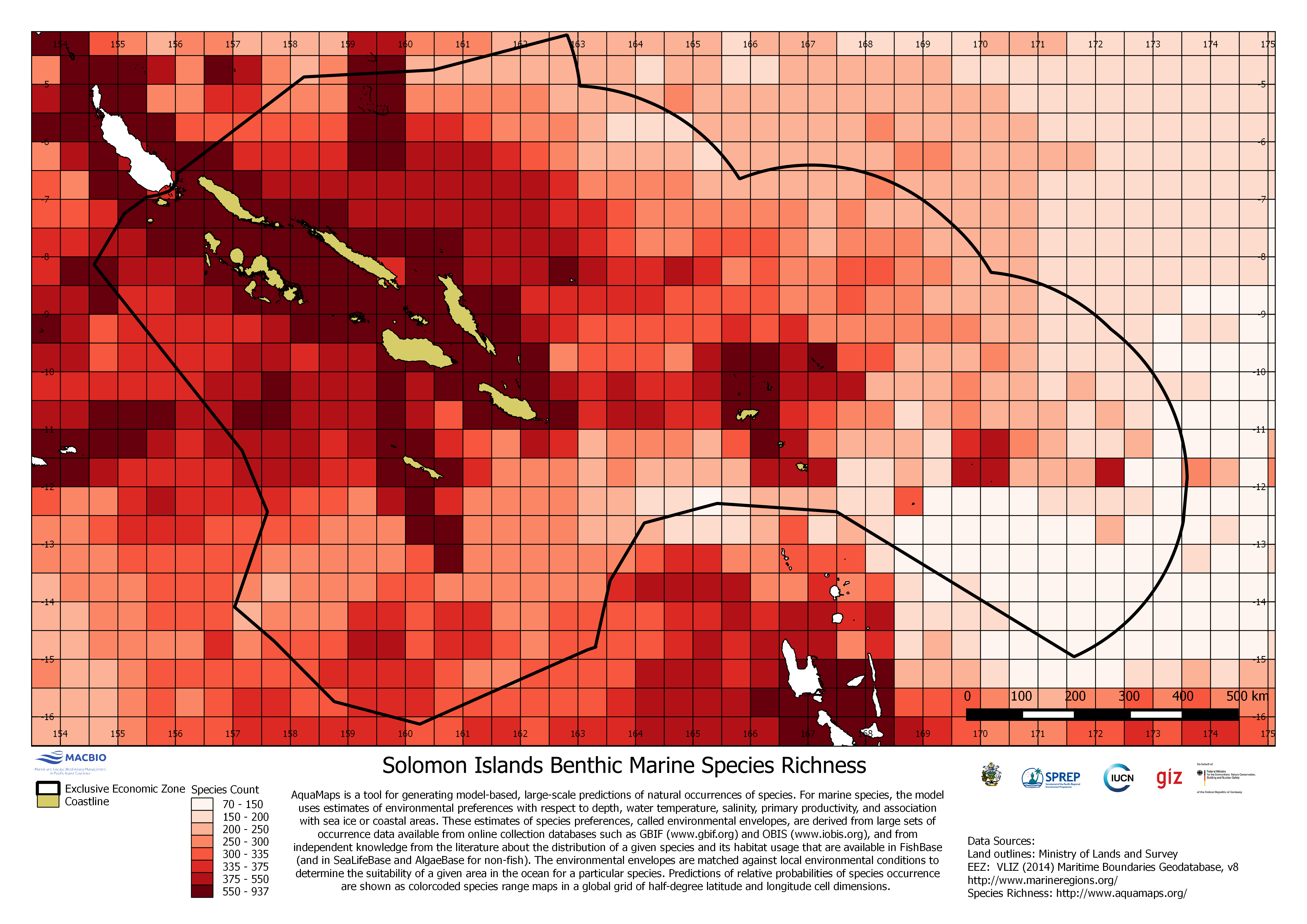 Map of predictions of relative probabilities of benthic marine species occurence in a global grid of half-degree latitude and longitude cell dimensions.