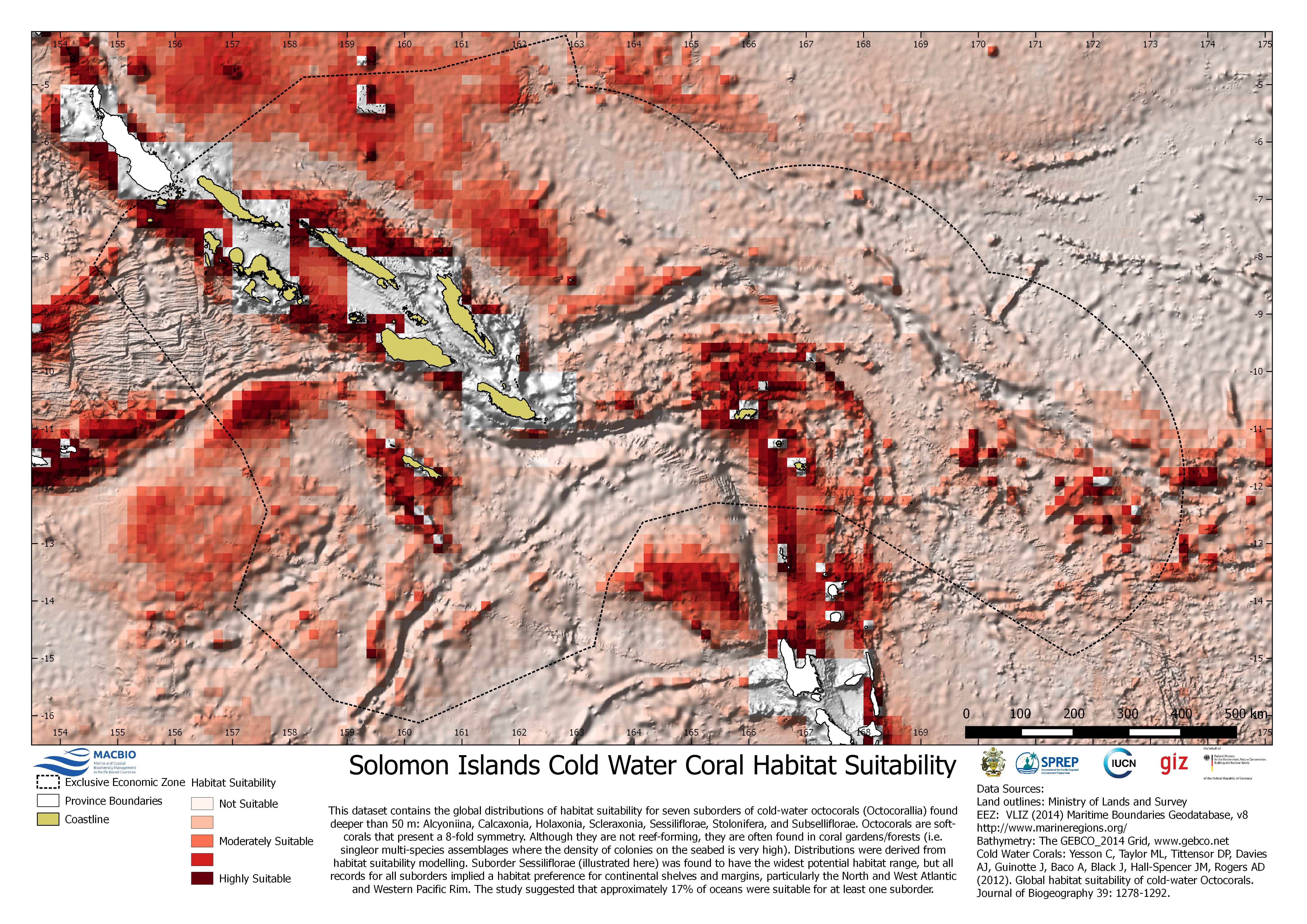 The map contains the global distribution of habitat suitability for seven suborders of cold water octocoral found deeper than 50m. Map is based on data from Yesson et al (2012) Global habitat suitability of cold water Octocorals, Journal of Biogeography 39, 1278-1292.