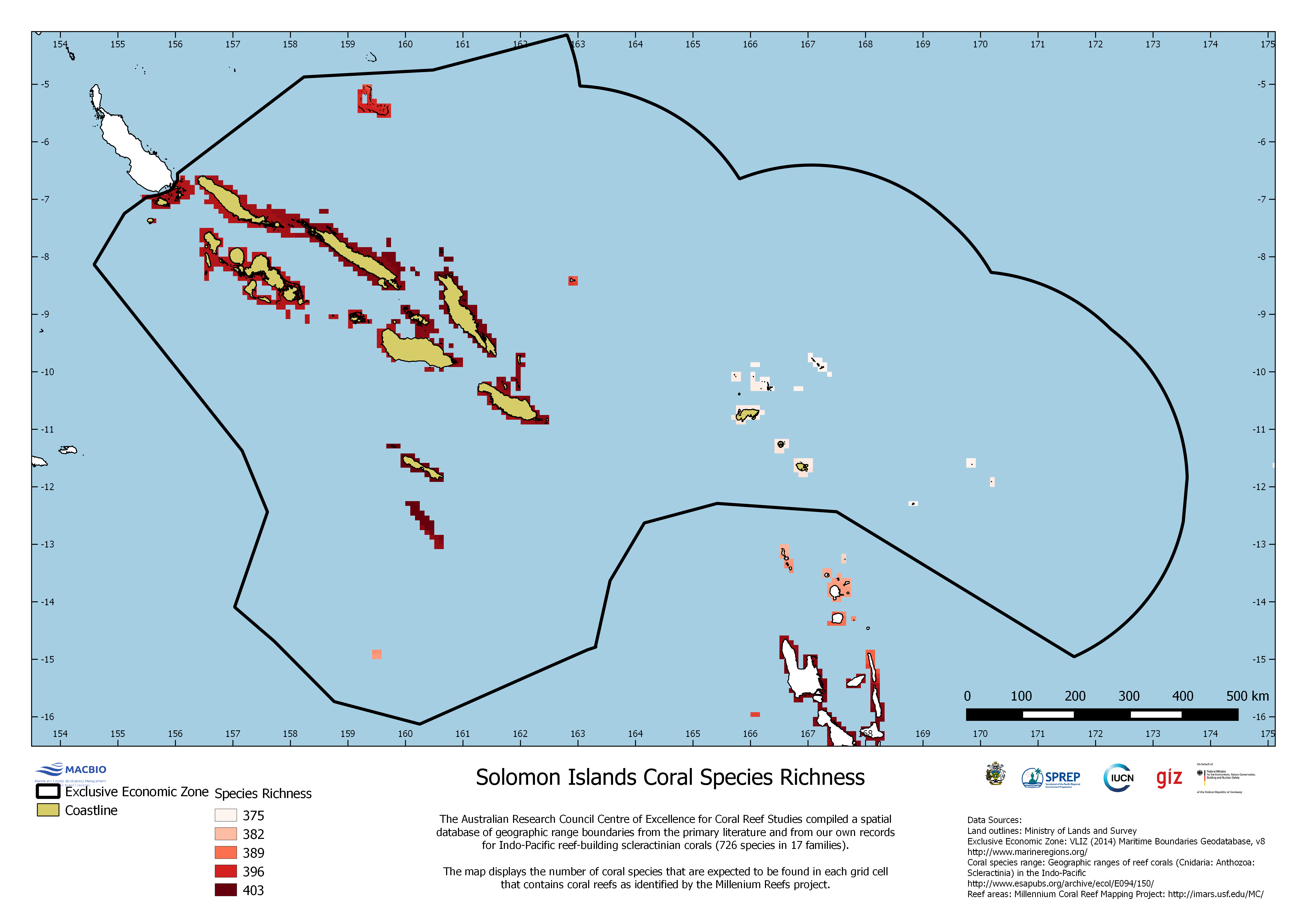 The map displays the number of coral species that are expected to be found in each grid cell that contains coral reefs as identified by the Millenium Reefs project. The map is based on a spatial data base of geographic range boundaries compiled by the Australian Research Council Centre of Excellence for Coral Reef Studies compi