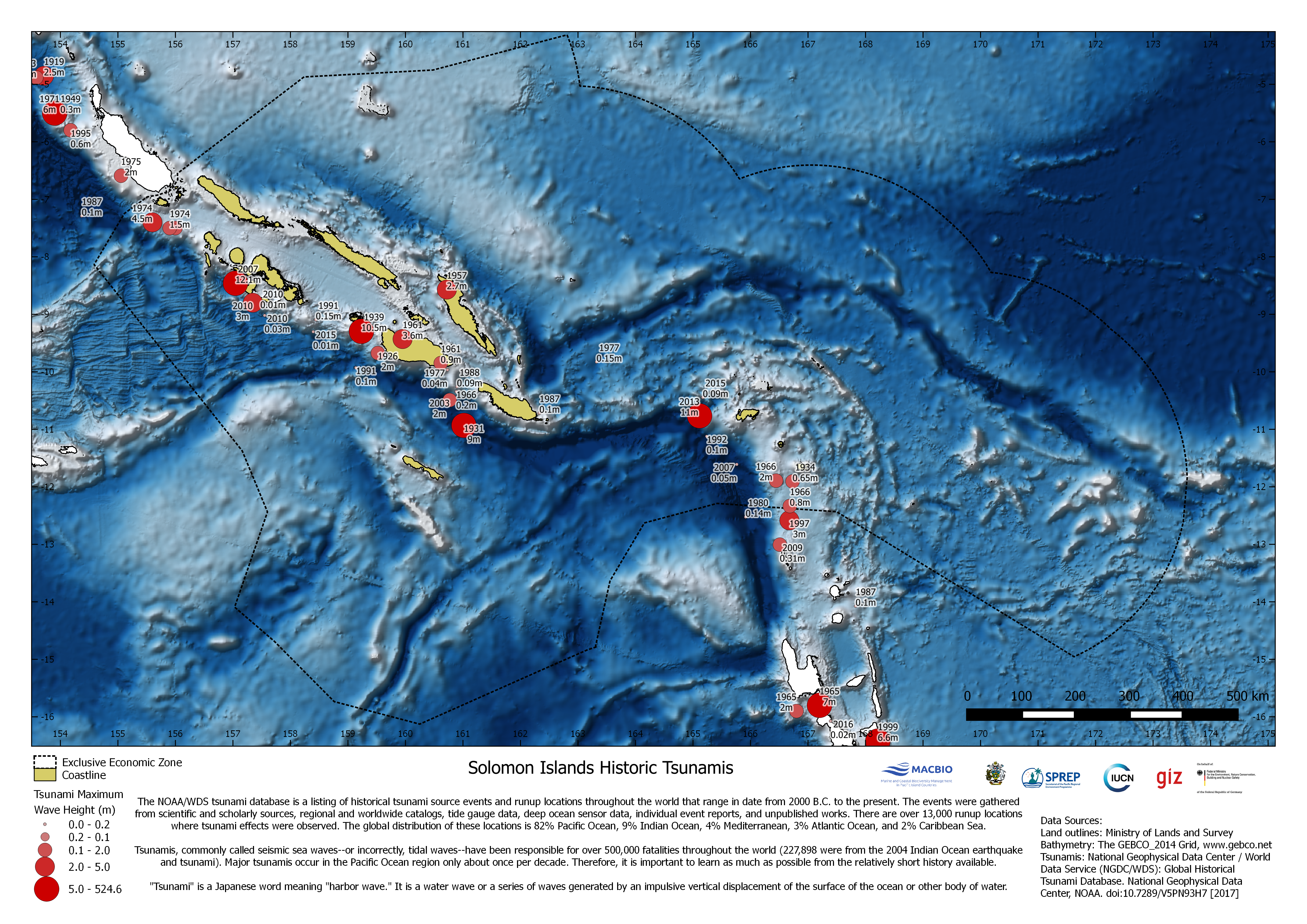 Map showing the location and maximum wave height of historic tsunamis from 2000 B.C. to the present. Events were gathered from scientific, scholarly sources, regional and worldwide catalogues, tide gauge data, deep ocean sensor data, individual event reports and unpublished works. The map was compiled by MACBIO as resource for the bioregions workshop in Feb 2018. Data stems from the Global Historical Tsunami Database.