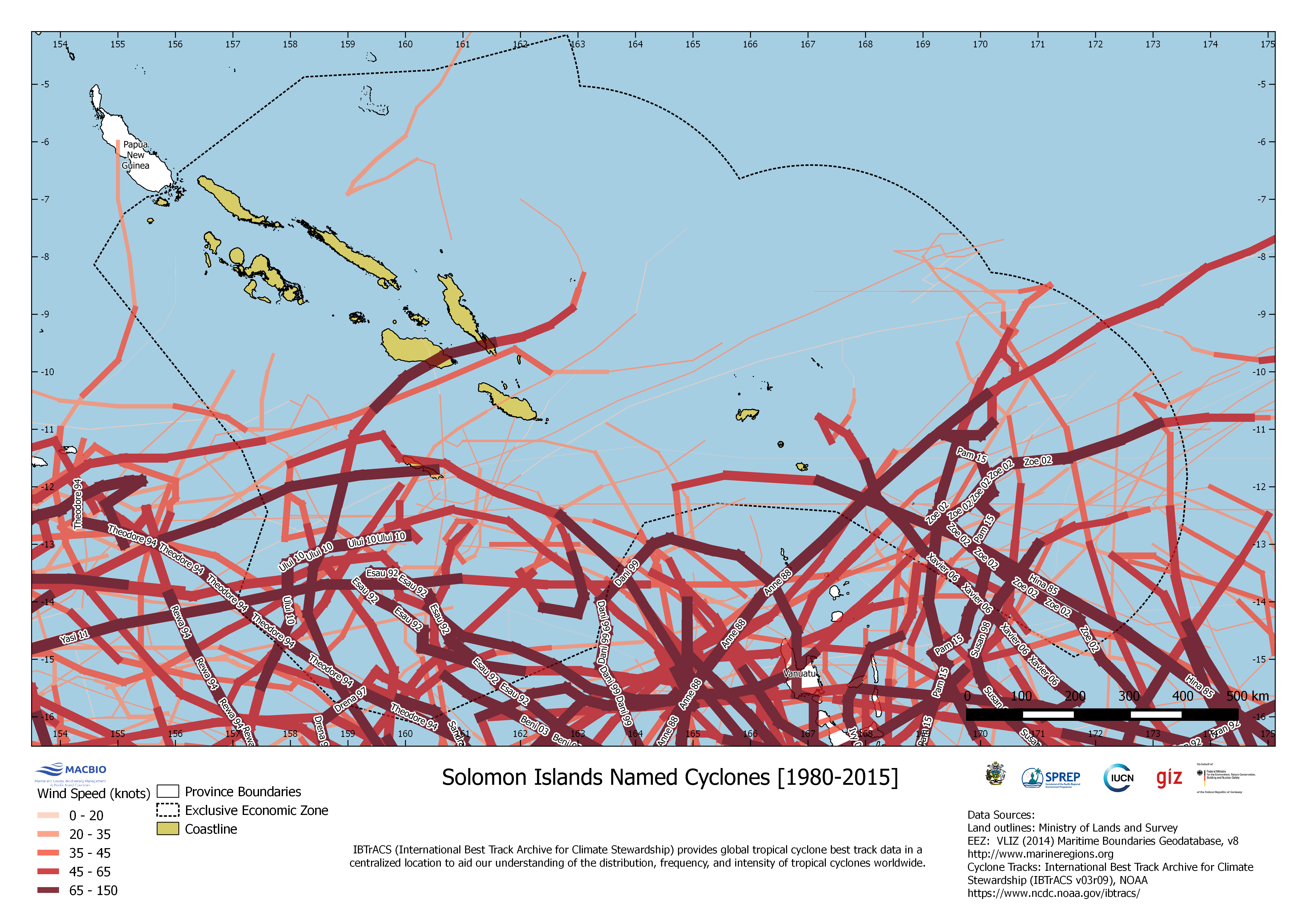 The map depicts paths and intensities of tropical cyclones in Solomon Islands EEZ from 1980 till 2015. Data of tropical cyclone best track data is provided by IBTrACS (International Best Track Archive for Climate Stewardship).
