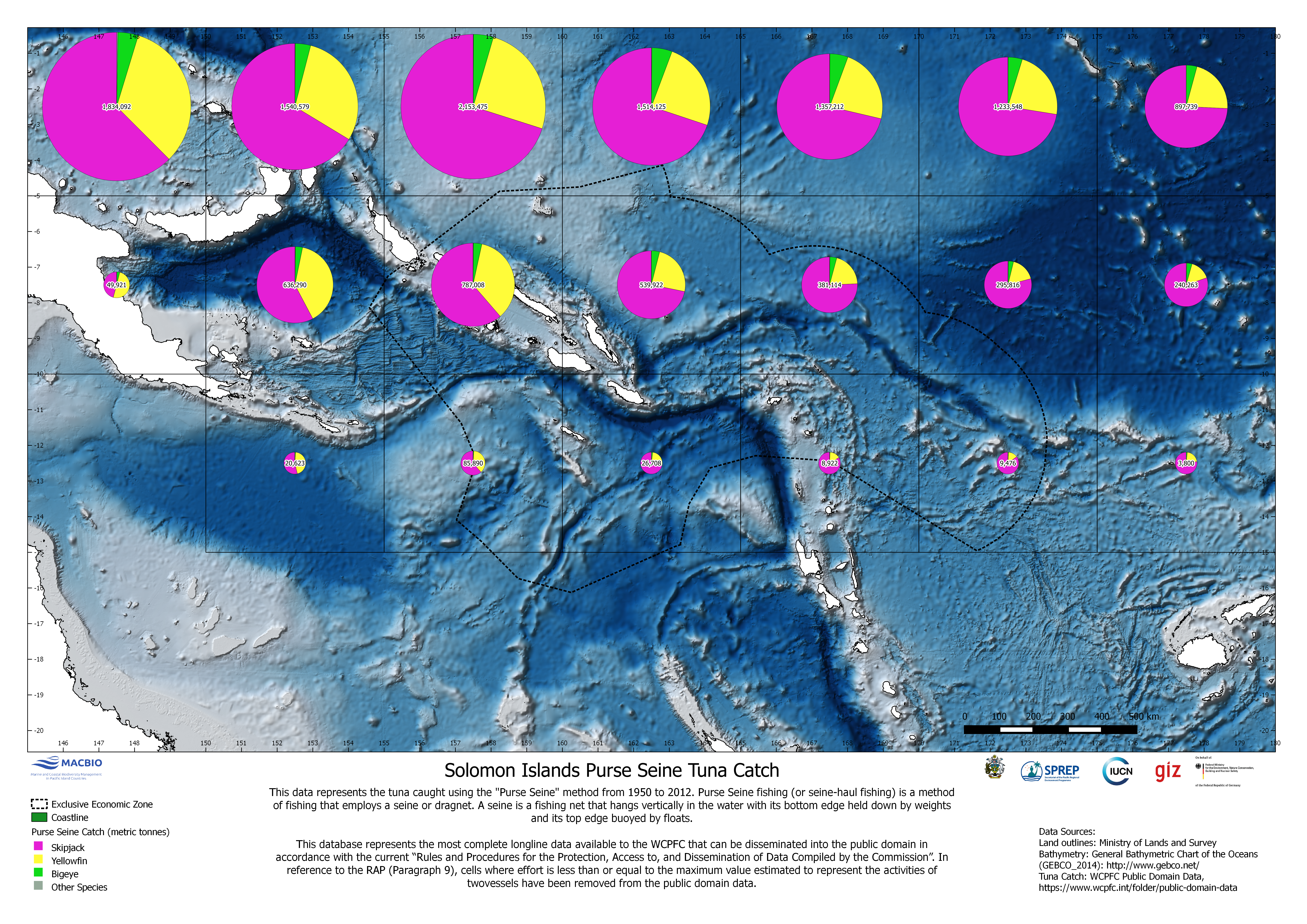 Map showing tuna catch using the "Purse Seine" method from 1950 - 2012. The map was developed by MACBIO as resource for the bioregions workshop in Feb 2018. Data is based on WCPFC Public Domain Data.