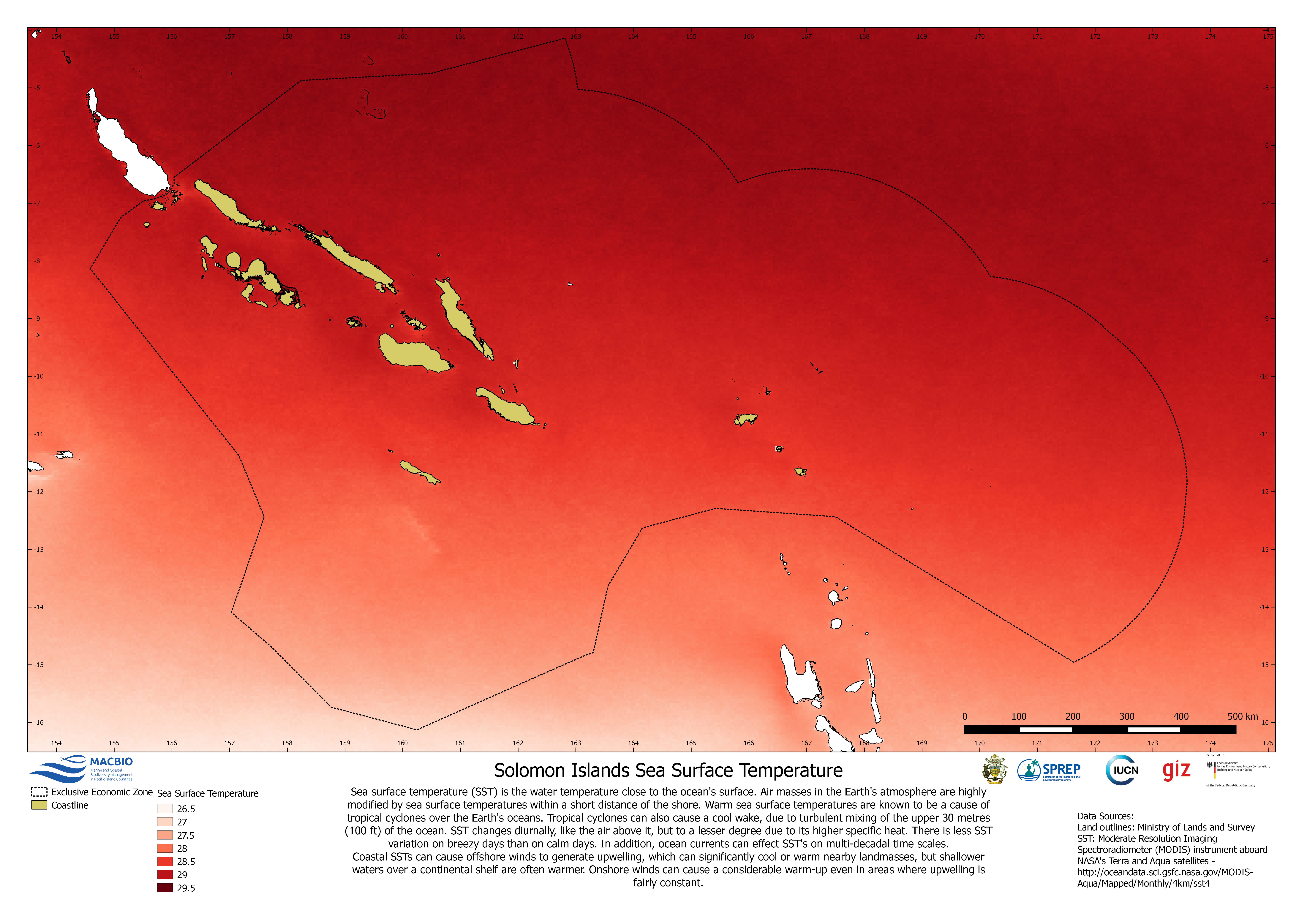 Map showing the sea surface temperature of Solomon Islands Ocean, the temperature close to the ocean's surface. Sea surface temperatures influence air masses in the Earth's atmosphere.