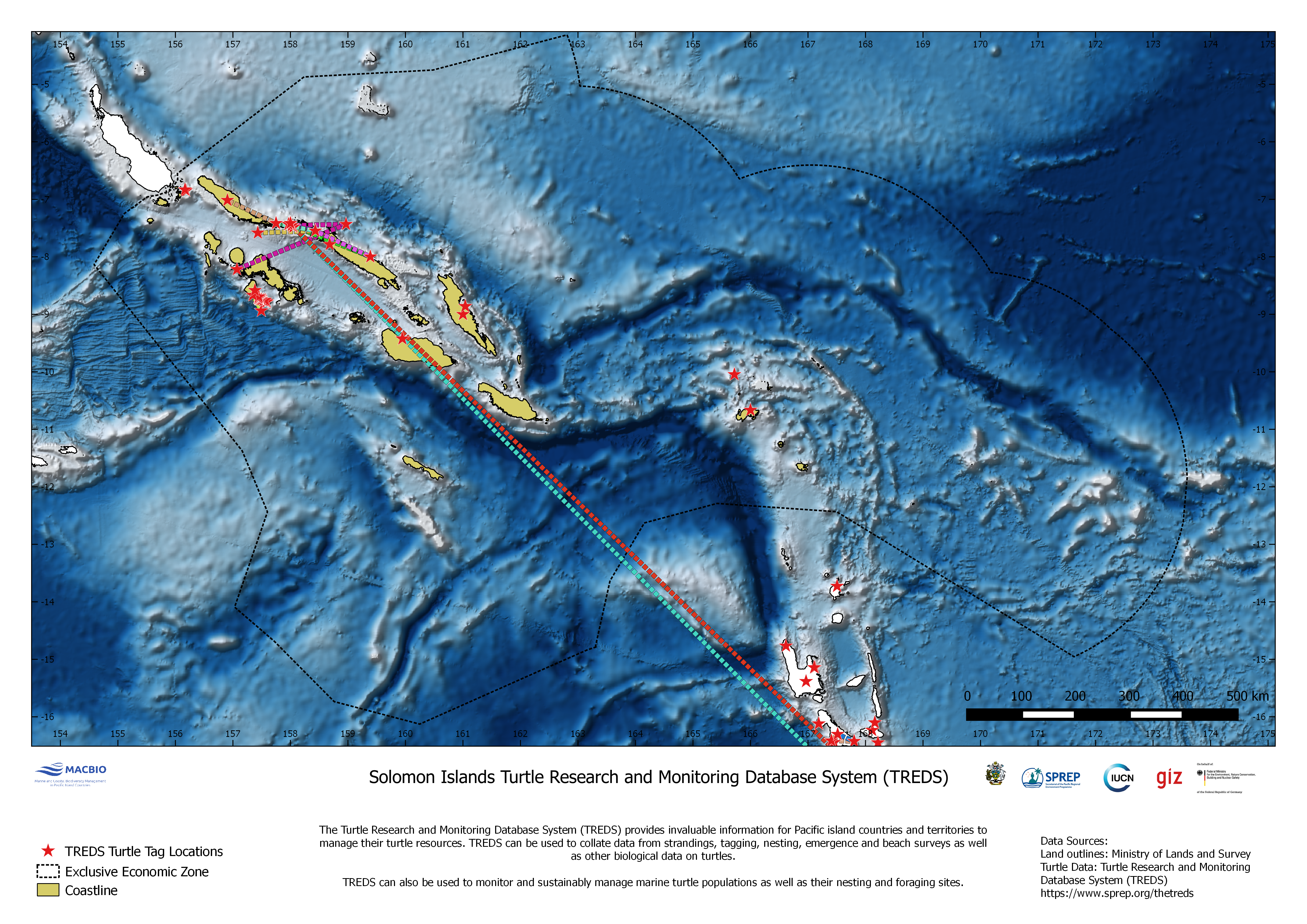 Map showing the location of Turtle tag stations and migration routes. The map was developed by MACBIO as resource for the bioregions workshop in Feb 2018. Data is based on SPREP's Turtle Research and Monitoring Database System (TREDS). TREDS provides invaluable information for Pacific Islands countries and territories to manage their turtle resources.